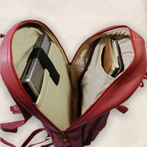 Our backpack has 3 generous size compartments, a zippered pocket at the front, a built-in pocket for stationery, cards, and a phone, the last house a 3-way compartment for your laptop, general storage, and a smaller open pocket.